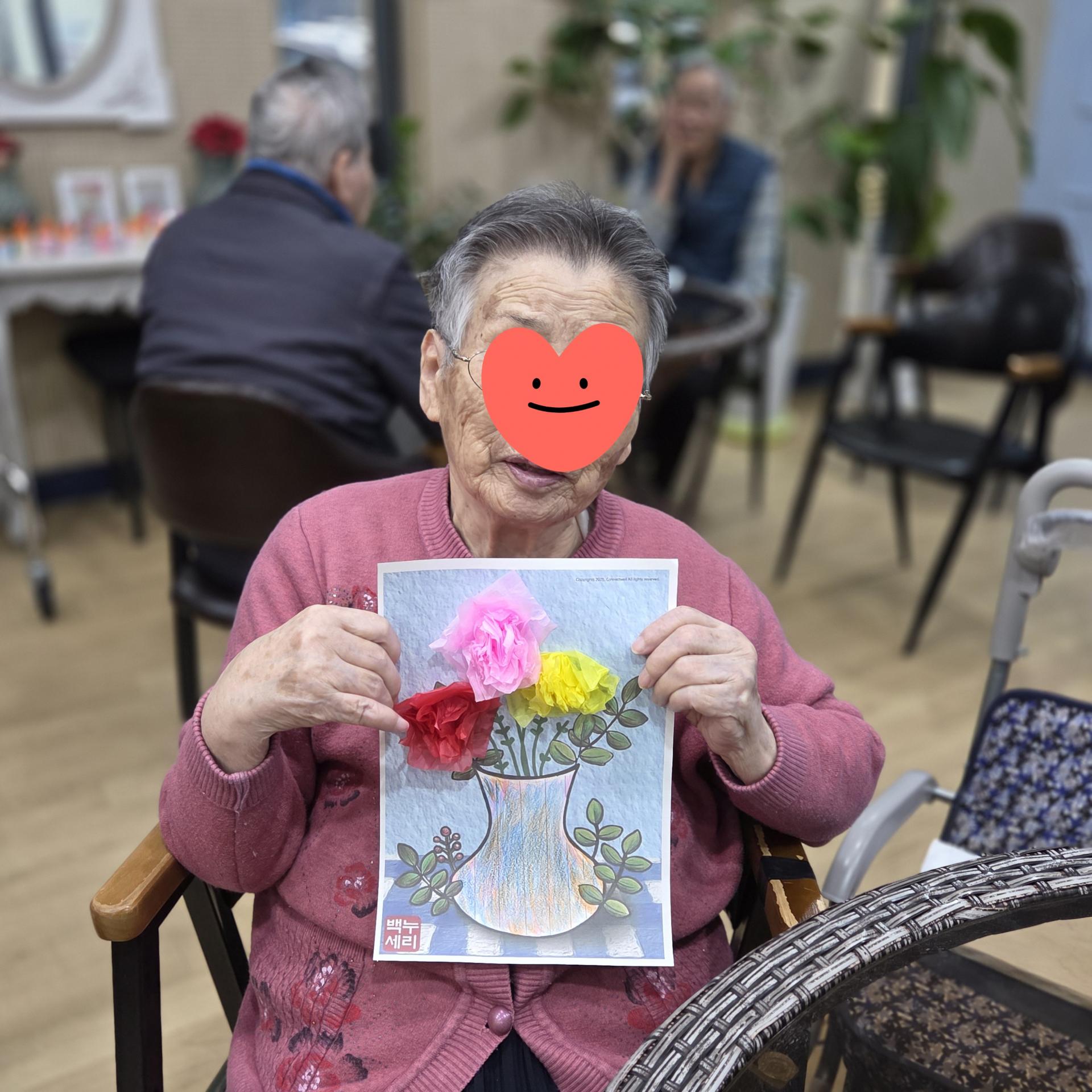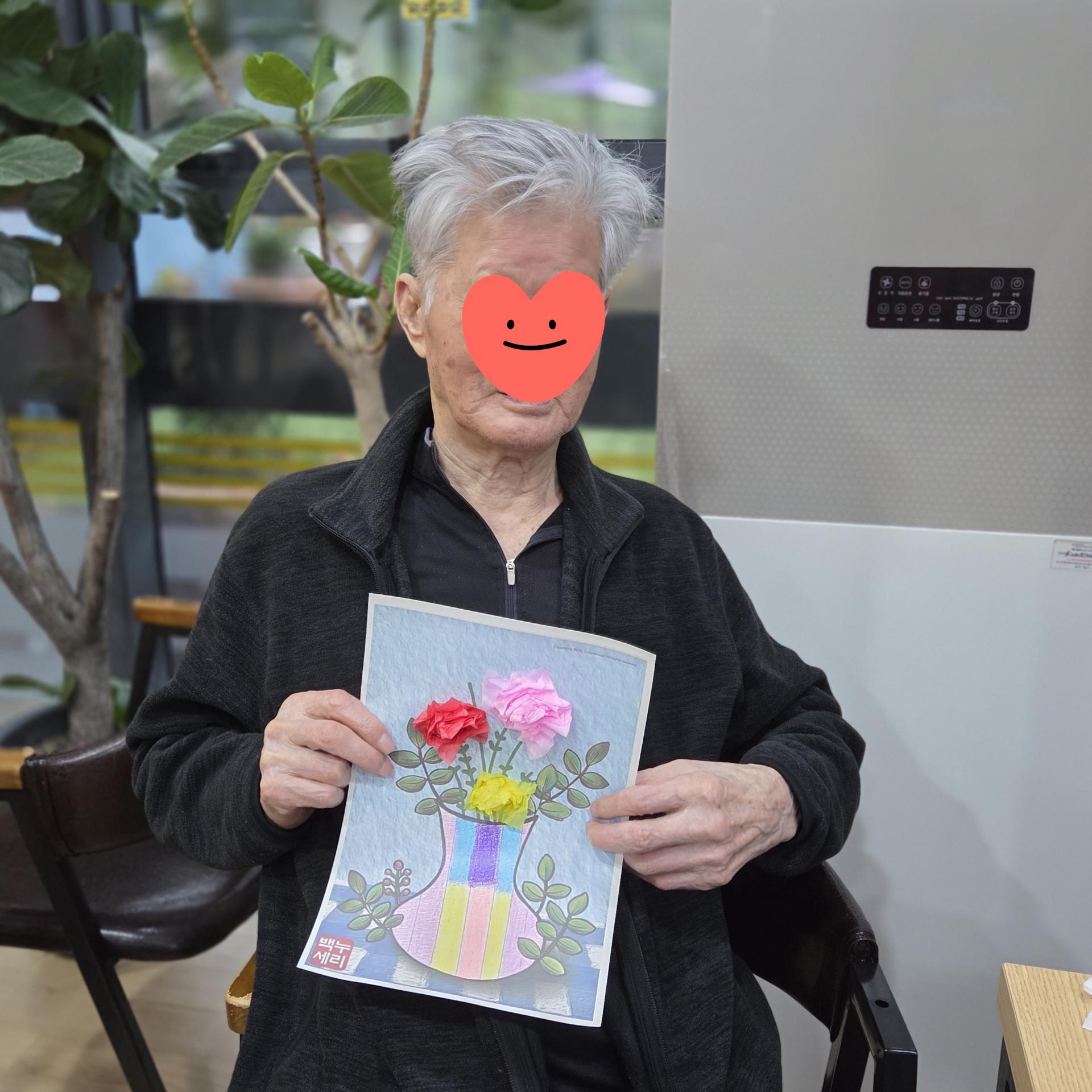 색칠하는 동안 “내가 만든 꽃병이 참 예쁘다” 하시며 흐뭇한 미소를 지으시고, 서로의 작품을 감상하며 칭찬을 나누는 모습이 인상 깊었습니다.