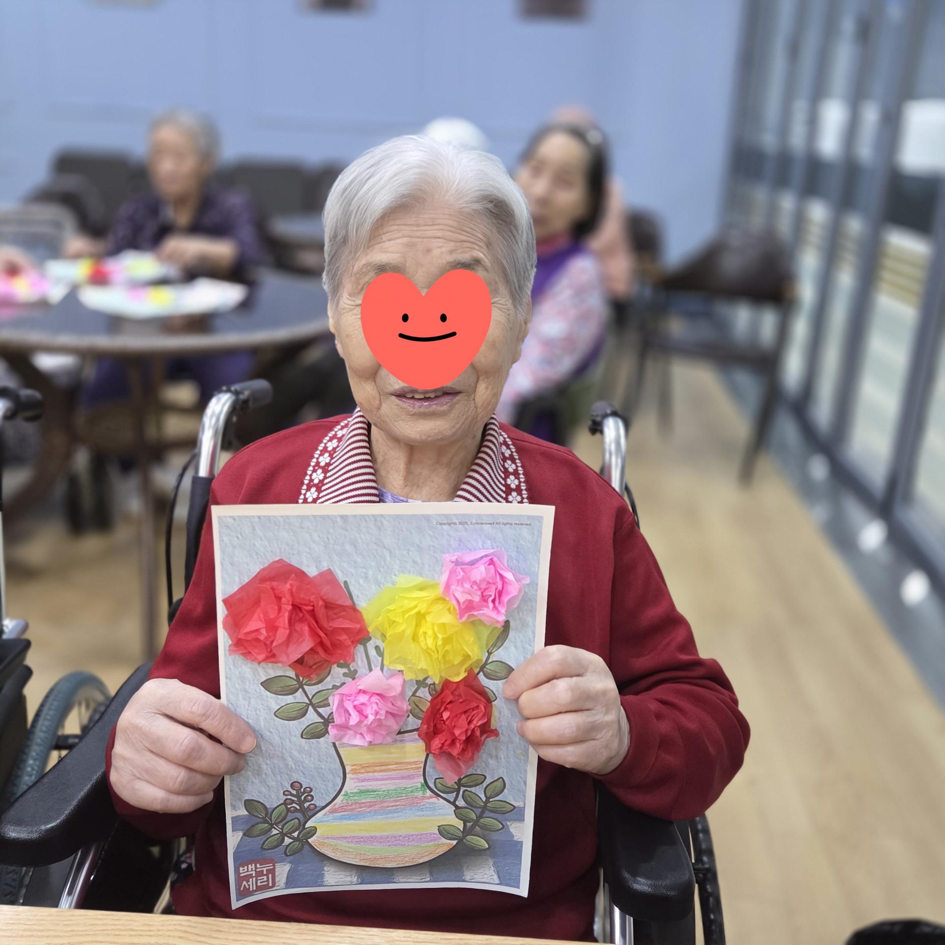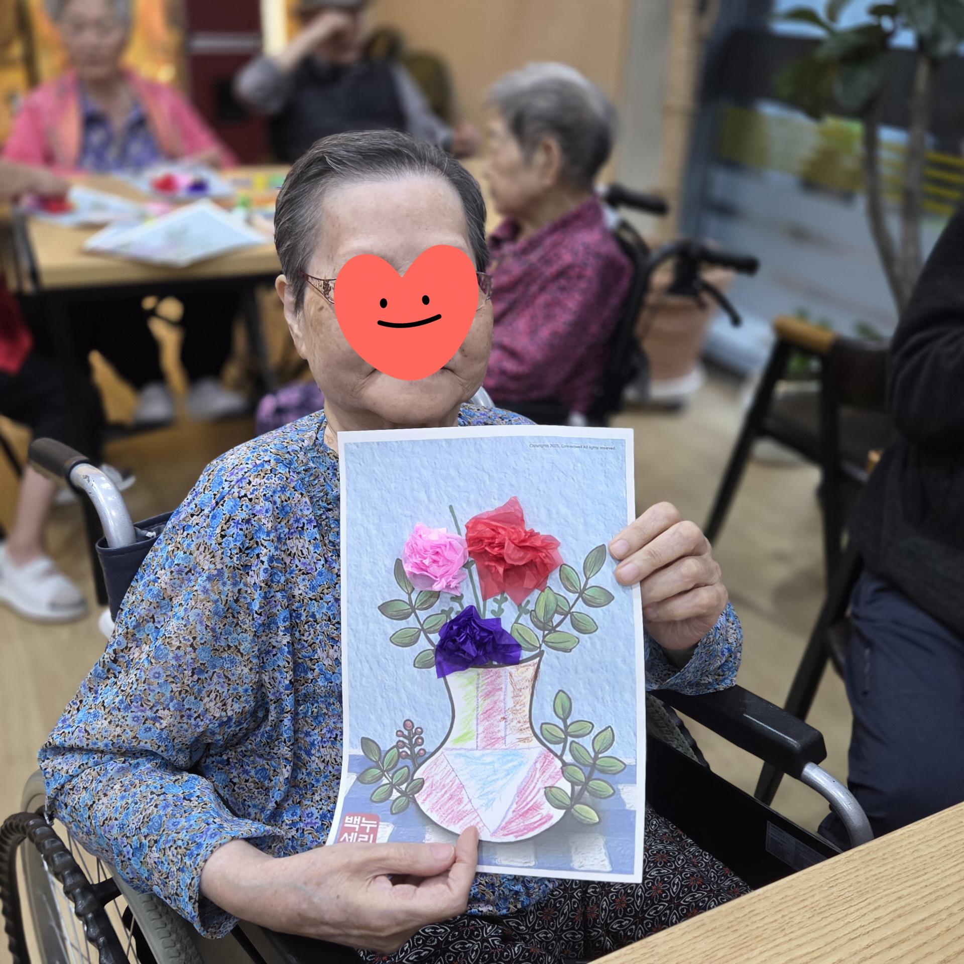 색칠하는 동안 “내가 만든 꽃병이 참 예쁘다” 하시며 흐뭇한 미소를 지으시고, 서로의 작품을 감상하며 칭찬을 나누는 모습이 인상 깊었습니다.작품 하나하나에 어르신들의 따뜻한 감성과 개성이 담겨, 마치 작은 전시회를 연 듯했습니다.